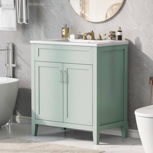 30 in. W Single Sink Bath Vanity in Green with White Ceramic Top and 2-Multi-functional Drawers with Sildes
