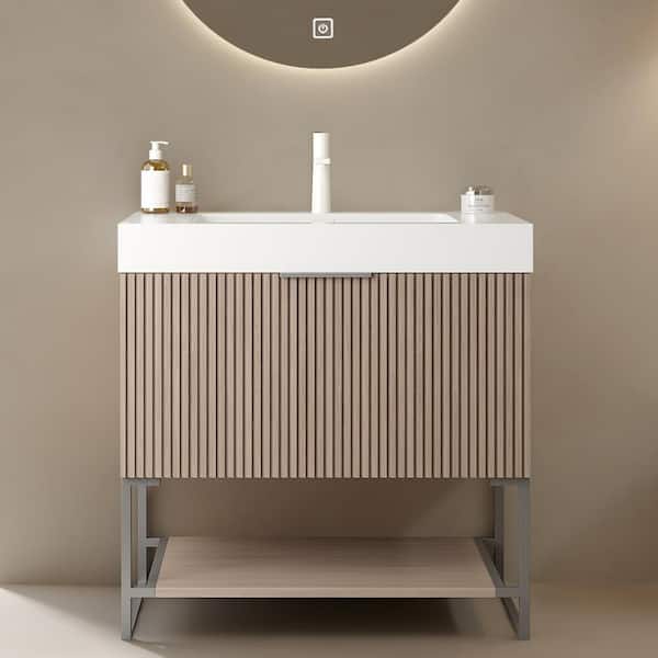 30 in. W Single Sink Bath Vanity in Light Brown Oak with White Acrylic Top, Drawer and Open Shelf, Pre-assembled