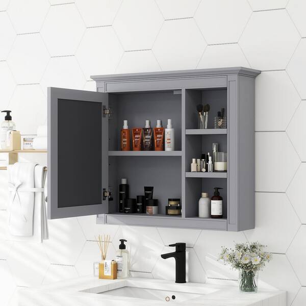 30 in. W x 28 in. H Gray Rectangular Wood Medicine Cabinet with Mirror and 3-Open Shelves