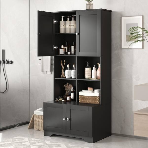 31 in. W x 12 in. D x 67 in. H Black Linen Cabinet with Four Doors and Open Multi-Layer Shelves