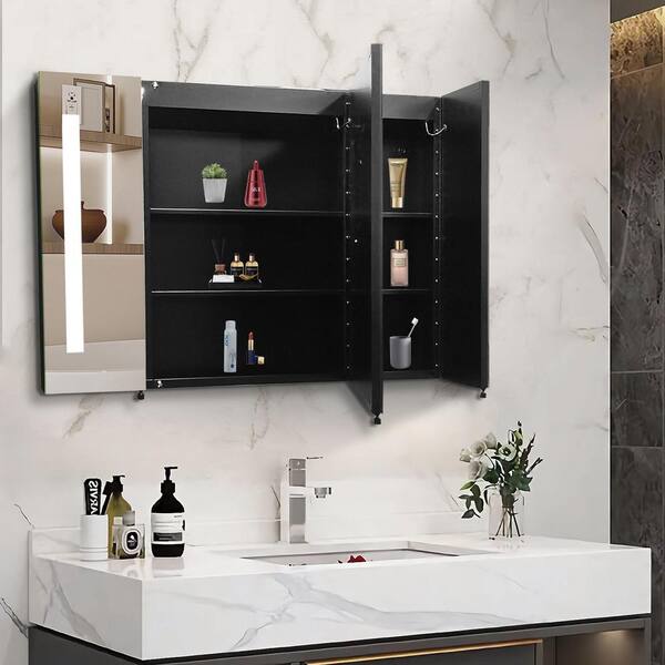 36 in. W x 26 in. H Rectangular Black Aluminum Surface Mount Medicine Cabinet with Mirror, Adjustable Light and Anti-Fog