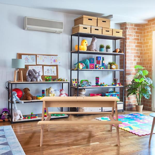 37 in. Brown Wood Rectangle 3-in-1 Kids Outdoor Picnic Tables with Blue and White Umbrella and Play Boxes