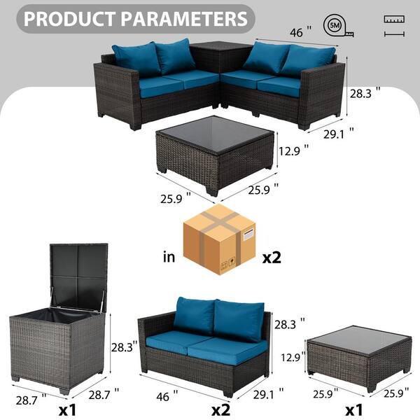 4-Piece Brown Wicker Patio Outdoor Sectional Sofa Set with Peacock blue Cushions and 1-Coffee Table