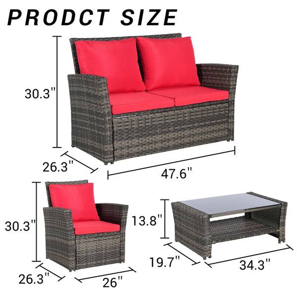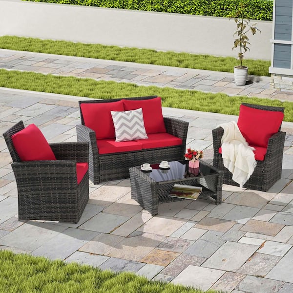 4-Piece Gray Wicker Outdoor Sectional Sofa Set with Red Cushions and 1-Glass Coffee Table