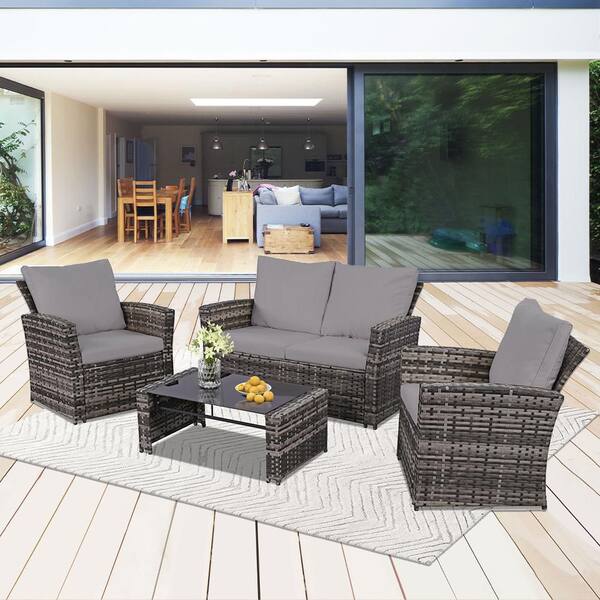 4-Piece Gray Wicker Patio Conversation Set with Gray Cushions for Garden, Porch, Backyard