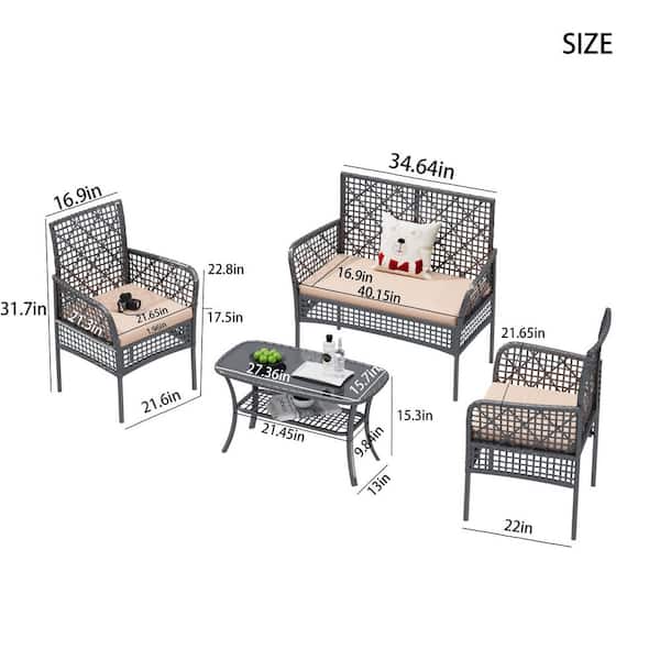 4-Piece Wicker Patio Conversation Set with Beige Cushions and Coffee Table for Backyard