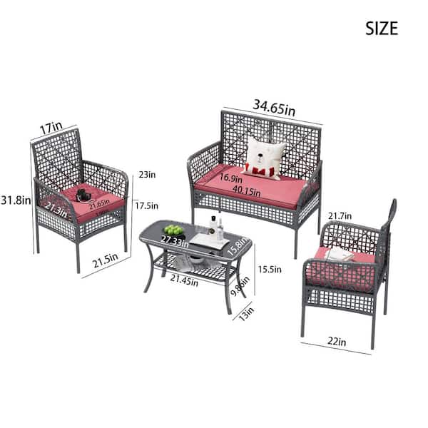 4-Piece Wicker Patio Conversation Set with Red Cushions and Coffee Table for Backyard