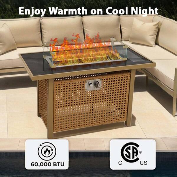 43 in. 60000 BTU Wicker Rectangular Propane Gas Fire Pit Table with Glass Wind Guard for Outside Patio