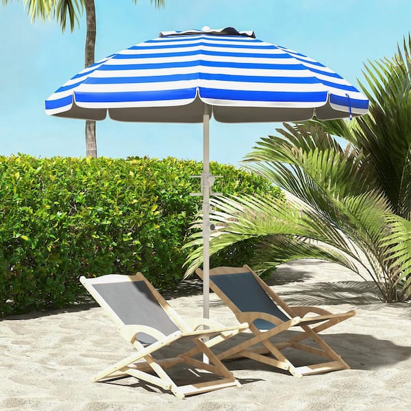 5.7 ft. Polyester Beach Umbrella in Blue White Stripe with Tilt, Adjustable Height, 2-Cup Holders and Hooks for Beach