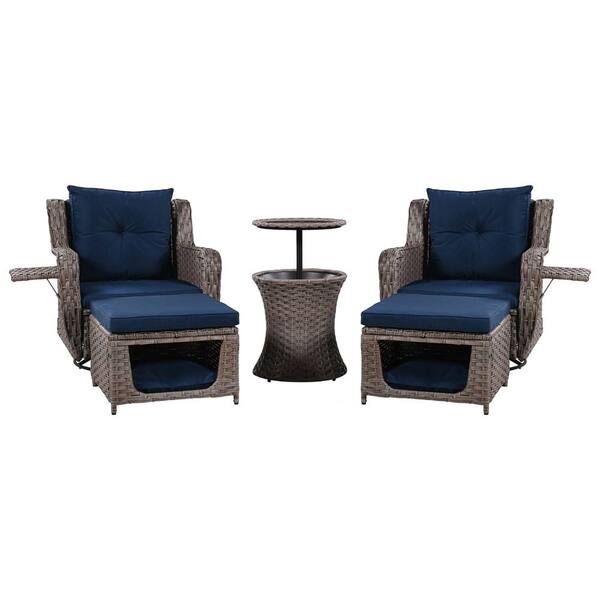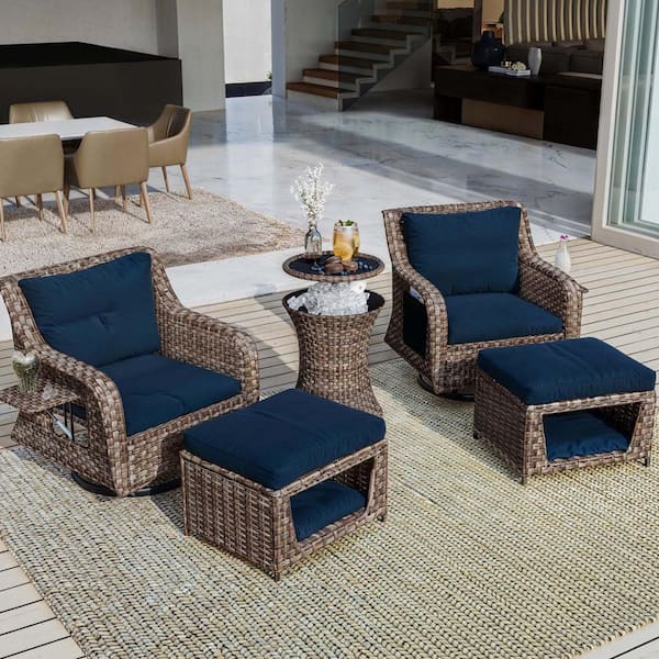 5-Piece Brown Wicker Patio Conversation Set with Navy Blue Cushions, Pet House Cool Bar and Retractable Side Tray