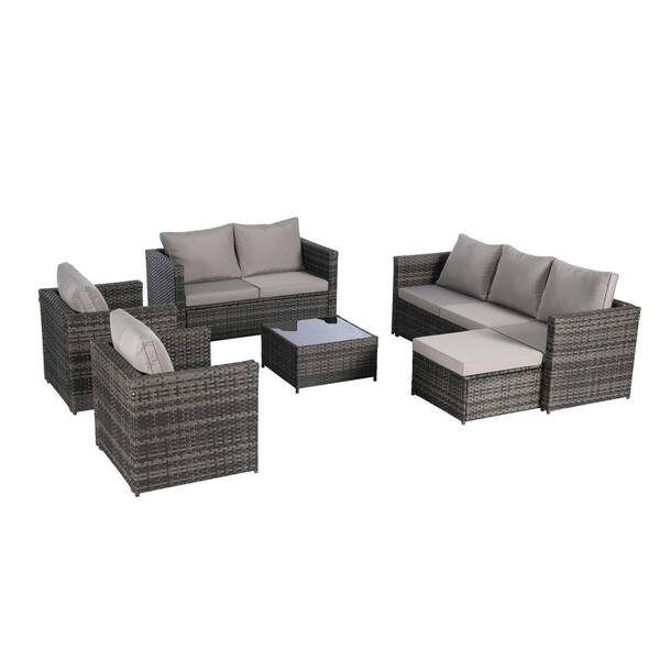 5-Piece Gray Wicker Outdoor Sectional Sofa Set with Light Gray Cushions, Pillows and 1 Glass Table