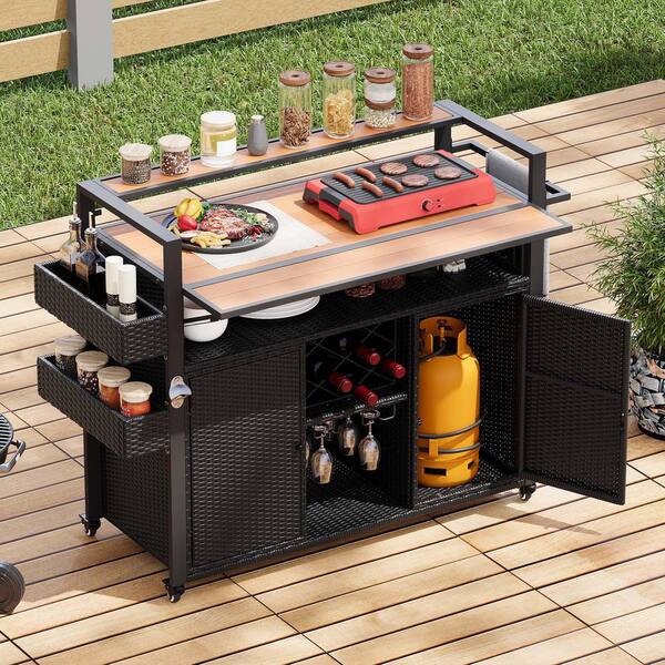 52.8 in. Black Wicker Outdoor Grill Cart with Extended Plastic Wood Table Top and Wheels