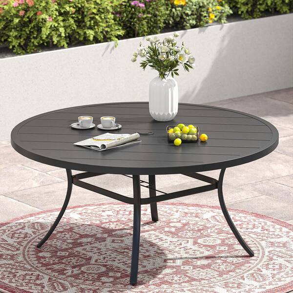 53 in. Round Metal Outdoor Dining Table with Umbrella Hole and Storage Shelf in Black