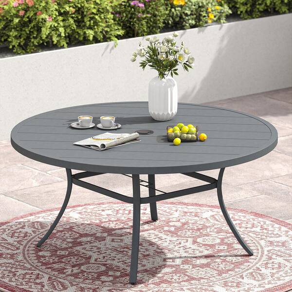 53 in. Round Metal Outdoor Dining Table with Umbrella Hole and Storage Shelf in Dark Gray