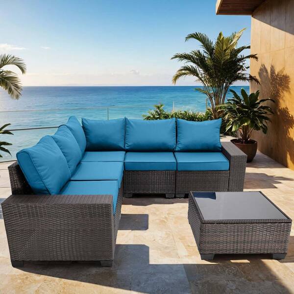 6-Piece Brown Wicker Patio Outdoor Sectional Sofa Set with Peacock blue Cushions and 1 Coffee Table