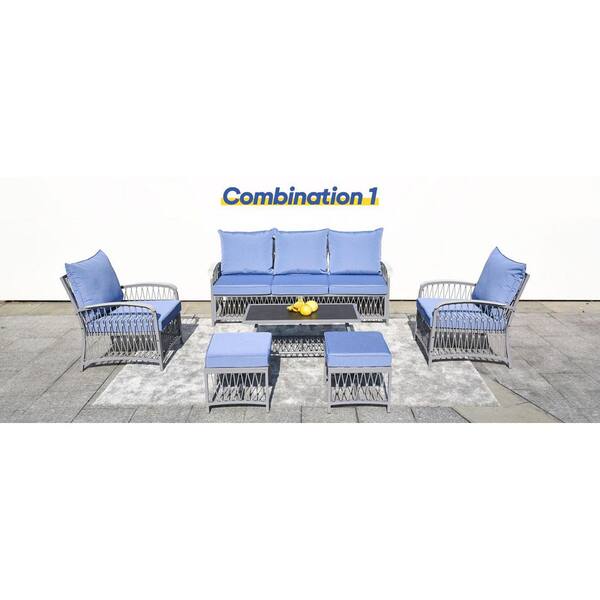 6-Piece Gray Metal Outdoor Conversation Set with Blue Cushions, Ottoman and 1 Coffee Table