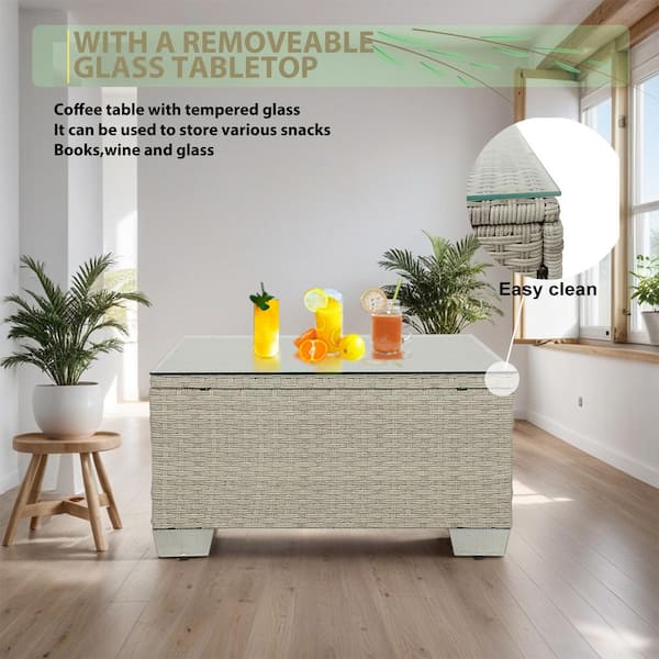 6-Piece Gray White Wicker Outdoor Sectional Set with Gray Cushions and Glass Coffee Table for Patio Backyard