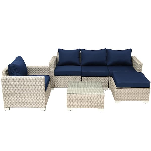 6-Piece Gray Wicker Patio Conversation Seating Set with Navy Blue Cushions and Coffee Table for Garden, Lawn, Backyard