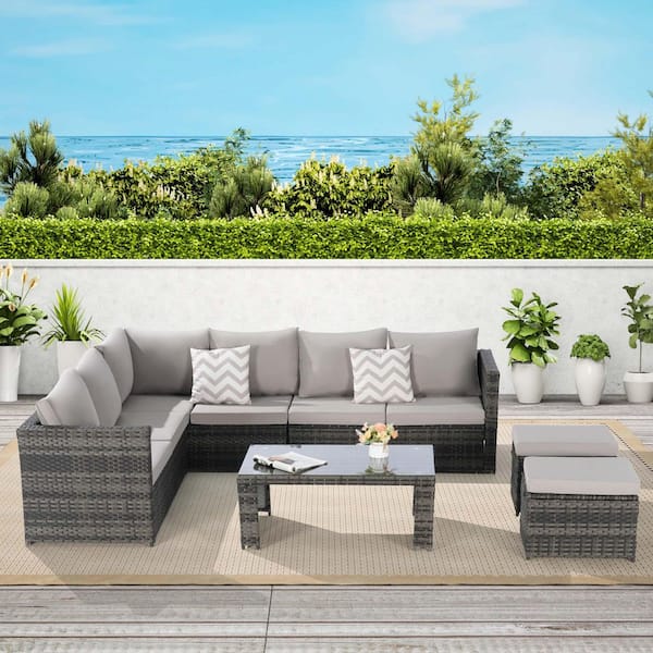 6-Piece Outdoor Wicker Sofa Conversation Set with Glass Table and Light Gray Cushions for Garden, Backyard