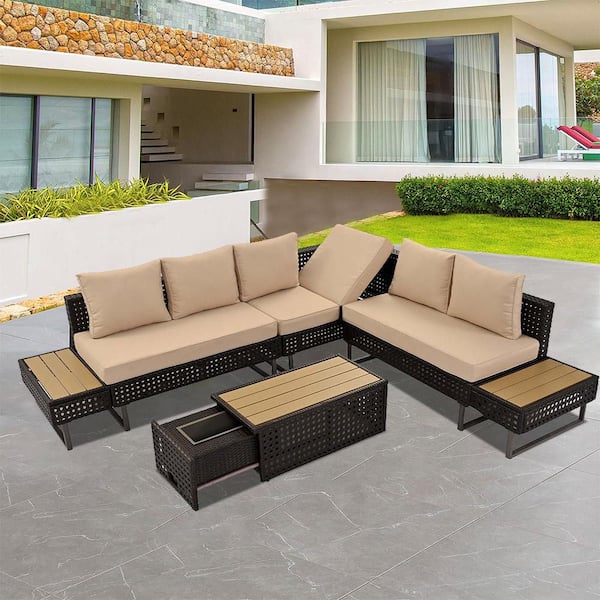 6-Piece Patio Furniture Diamond Wicker Outdoor Conversation Set with Khaki Cushion and Extendable Coffee Table