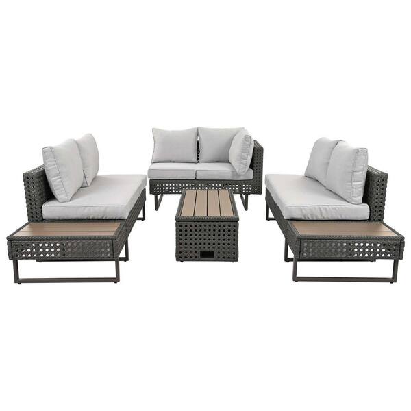 6-Piece Rattan Wicker Patio Conversation Set with Extendable Coffee Table Ice Bucket and Gray Cushions