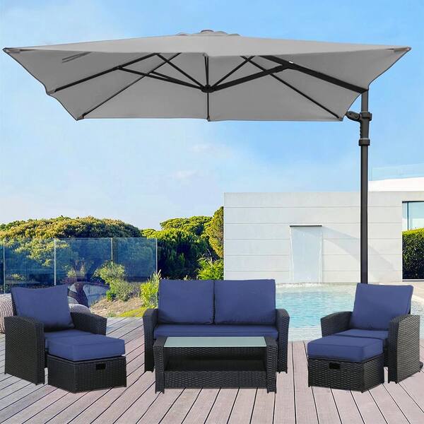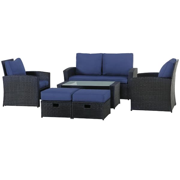 6-Pieces Black Wicker Outdoor Patio Sectional Sofa Conversation Set with Blue Cushions and 1-Coffee Table