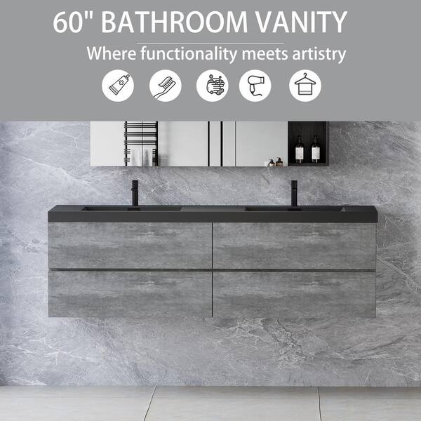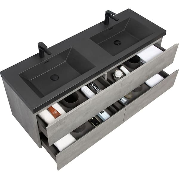 60 in. W Double Sink Floating Bath Vanity in Gray with Black Quartz Sand Top and Four Drawers, Pre-assembled