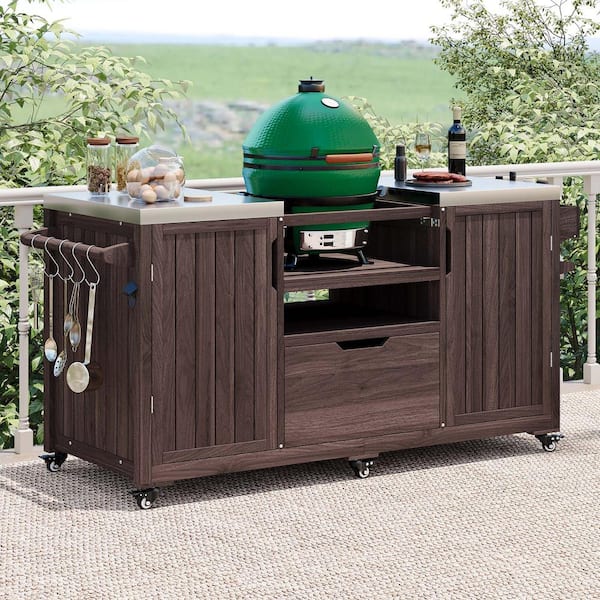 66.5 in. Dark Brown Outdoor Grill Cart Kitchen Island with Stainless Steel Top, Drawer, Large Big Green Egg