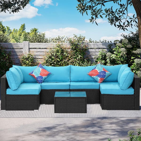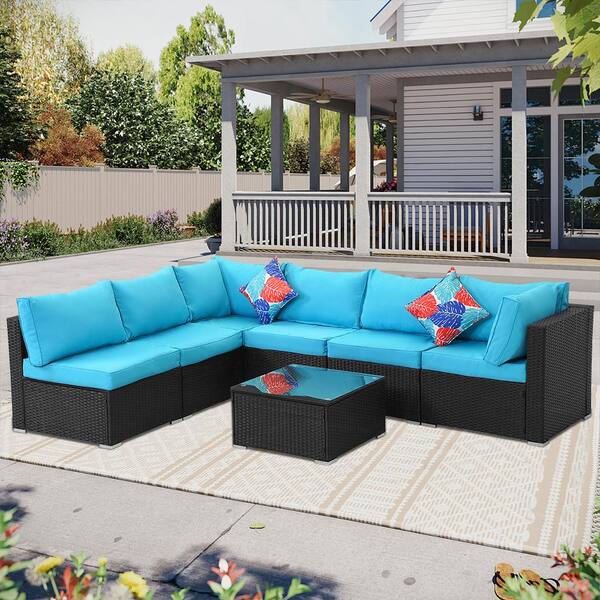 7--Piece Black Wicker Outdoor Patio Sectional Sofa Conversation Set with Blue Cushions and 1 Coffee table