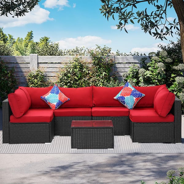 7--Piece Black Wicker Outdoor Patio Sectional Sofa Conversation Set with Red Cushions and 1 Coffee table