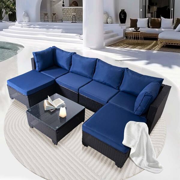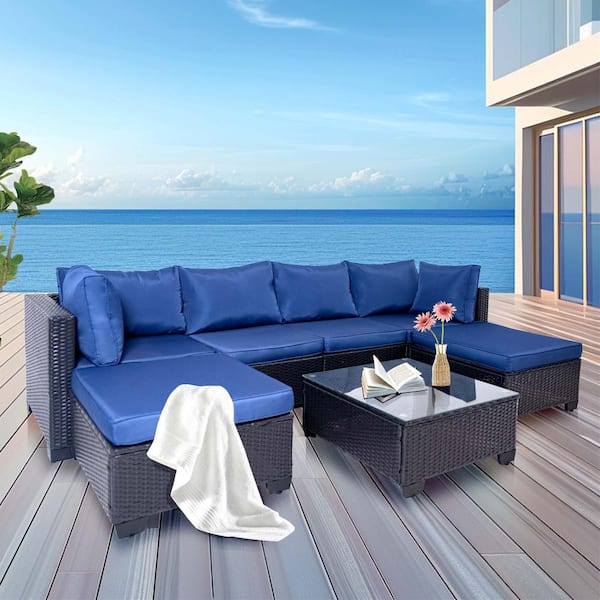 7-Piece Black Wicker Outdoor Sectional Set with Blue Cushion and 1-Side Table for Patio, Balcony, Backyard