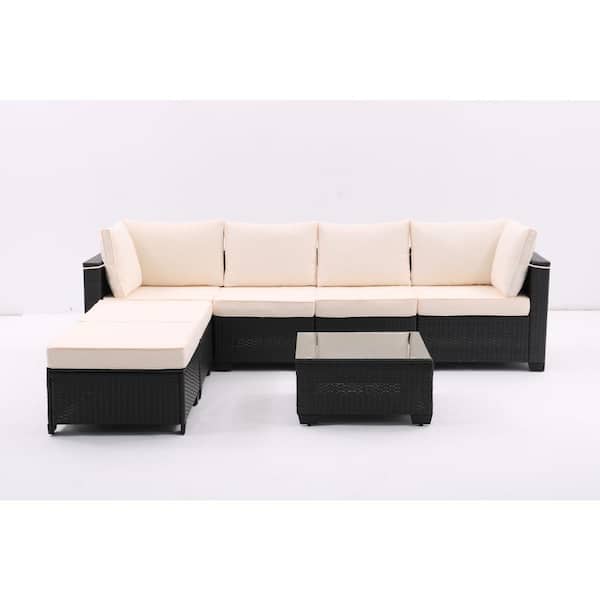 7-Piece Dark Coffee Wicker Outdoor Sectional Sofa Set with Corner Chairs Ottomans Glass Top Table and Beige Cushions