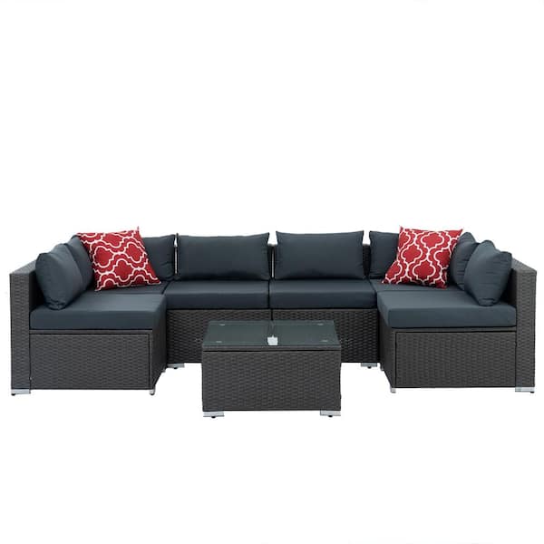 7-Piece Dark Gray Wicker Outdoor Patio Conversation Sectional with Dark Blue Cushions and Coffee Table