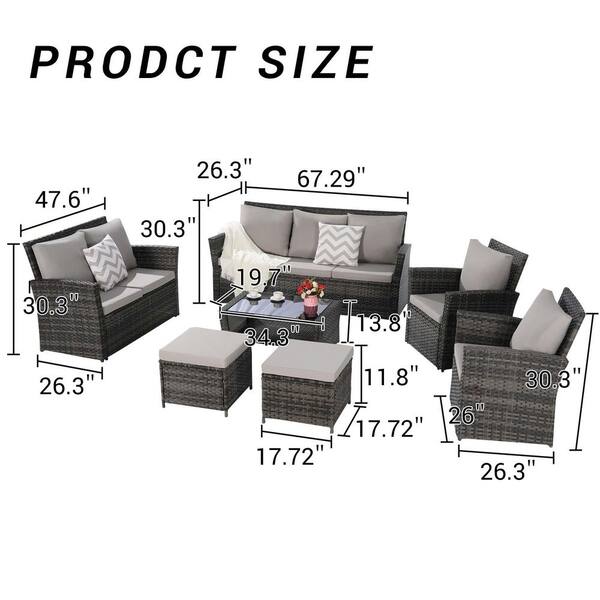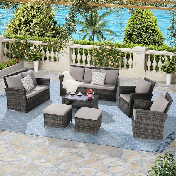 7-Piece Gray Wicker Outdoor Patio Conversation Set with Light Gray Cushions and 1 Coffee Table for Garden