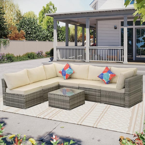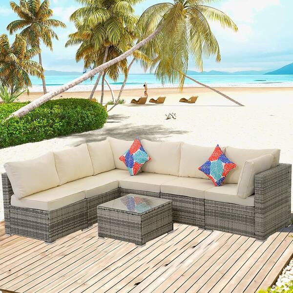 7--Piece Gray Wicker Outdoor Patio Sectional Sofa Conversation Set with Beige Cushions and 1 Coffee table