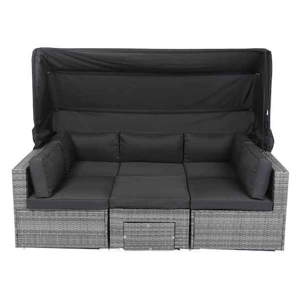 7-Piece Gray Wicker Outdoor Sectional Sofa Set with Retractable Canopy Black Cushions for Lawn Garden Backyard Porch