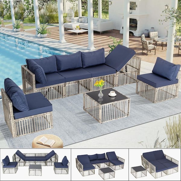 7-Piece Outdoor Wicker Sectional Conversation Set with Adjustable Backrest Sofa Blue Cushions and Coffee Table
