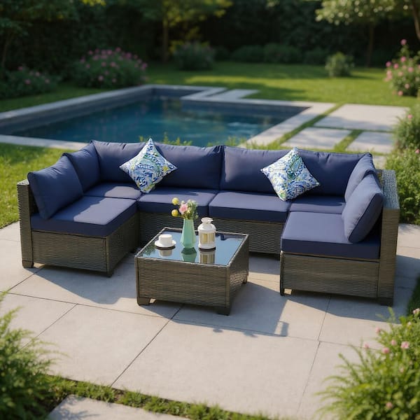 7-Piece Wicker Outdoor Sectional Set Conversation Sets with Blue Cushions for Backyard, Lawn