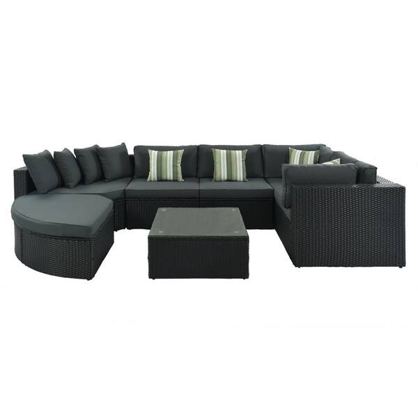 7-piece Black Wicker Outdoor Sofa Conversation Set with Green Pillows, Gray Cushions For Patio, Garden, Deck