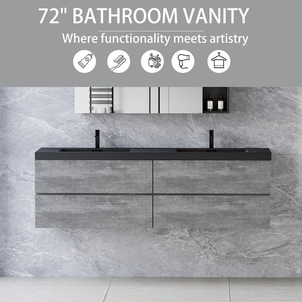 72 in. W Double Sink Floating Bath Vanity in Gray with Black Quartz Sand Top and Four Drawers, Pre-assembled
