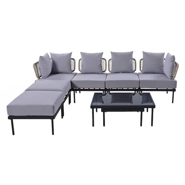 8-Piece Black Steel Patio Outdoor Conversation Set with Light Grey Cushions and 1 Glass Coffee Table