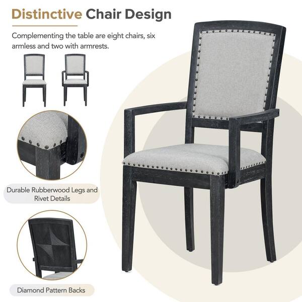 9-Piece Black Rubber Wood Outdoor Dining Set with 2-Padded Armchairs and Gray Cushions
