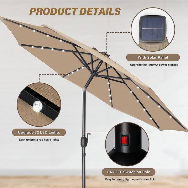 9 ft. 32 LED Lighted Steel Patio Umbrella in Brown with Push Button Tilt for Garden, Deck, Backyard