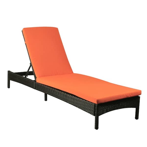 Adjustable Wicker Outdoor Chaise Lounge Patio Poolside Reclining Folding Backrest Lounge Chair with Orange Cushions