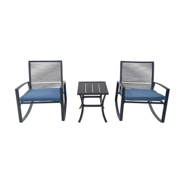 Blue 3-Piece Metal Outdoor Bistro Rocking Set with Red Cushions