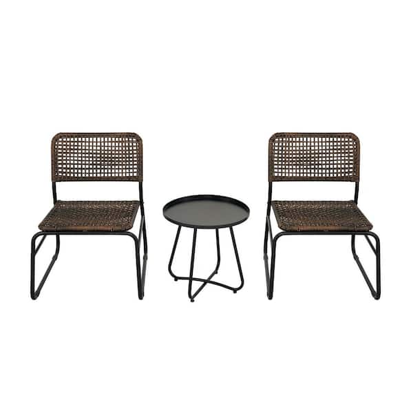 Brown 3-Piece PE Rattan Wicker Patio Conversation Sectional Set with Black Round Table for Garden, Backyard, Balcony