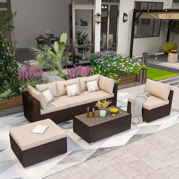 Brown 6-Piece Wicker Outdoor Patio Sectional Sofa Conversation Set with khaki Cushions, 1-Ottoman, and 1-Coffee table