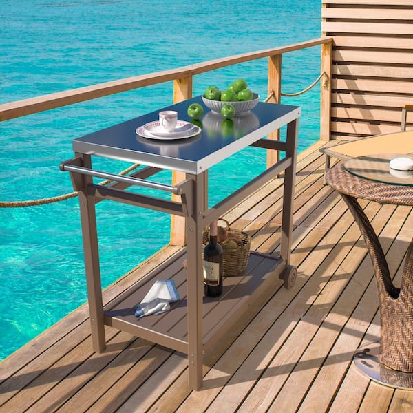 Brown Outdoor Prep Cart Dining Table for Pizza Oven, Patio Grilling Backyard BBQ Grill Cart