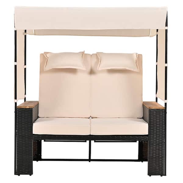 Brown Wicker 2-Pieces Outdoor Patio Lounge Roof Sectional Set with Beige Cushions and Adjustable Backrest
