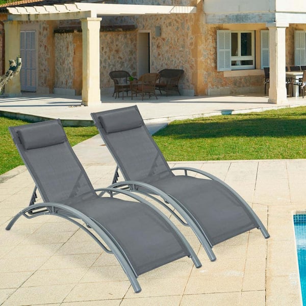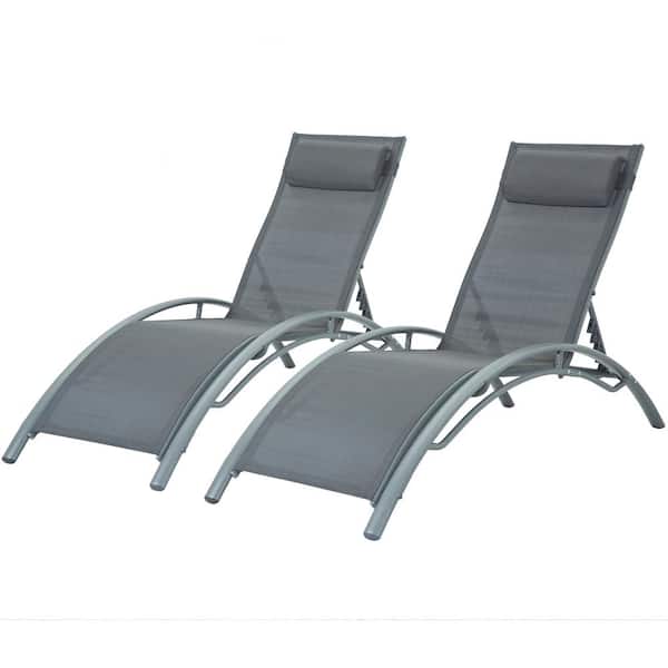Gray 2-Piece Aluminum Outdoor Chaise Lounge Chair Recliner with 5-Level Adjustable Backrest and Gray Pillow